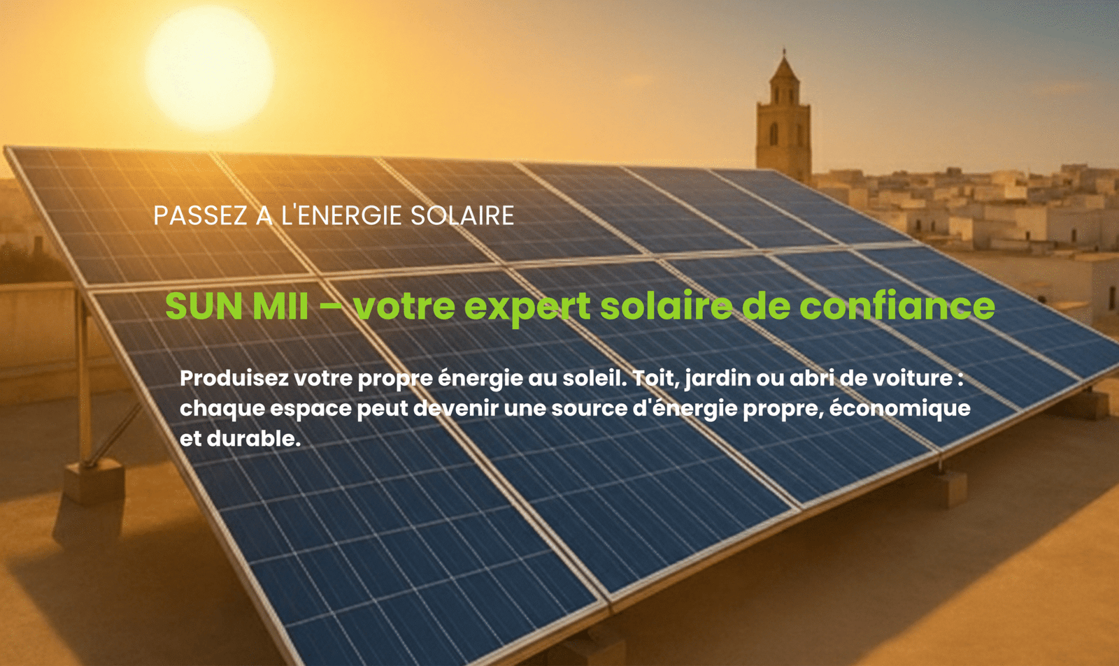 Votre rêve de réduire le coût élevé des factures d’électricité est aujourd’hui réalisable ! SUN MII vous garantit la prise en charge totale pour passer en toute simplicité vers une énergie solaire efficace qui prend soin de votre argent et de votre environnement.